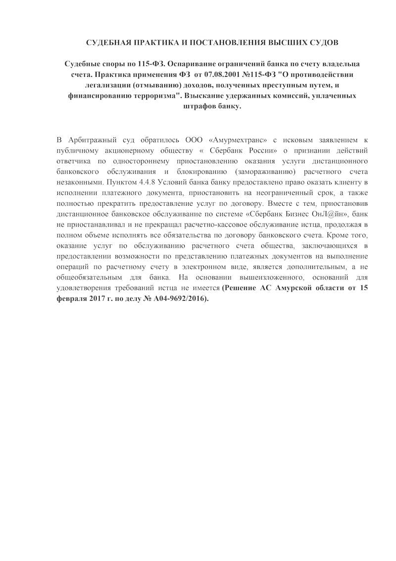 Клиент обратился к нам в связи с отключением доступа к ДБО. Сбербанк ссылаясь на 115 ФЗ заблокировал функционал личного кабинета банка, отключив возможность использования дебетового расчетного счёта.