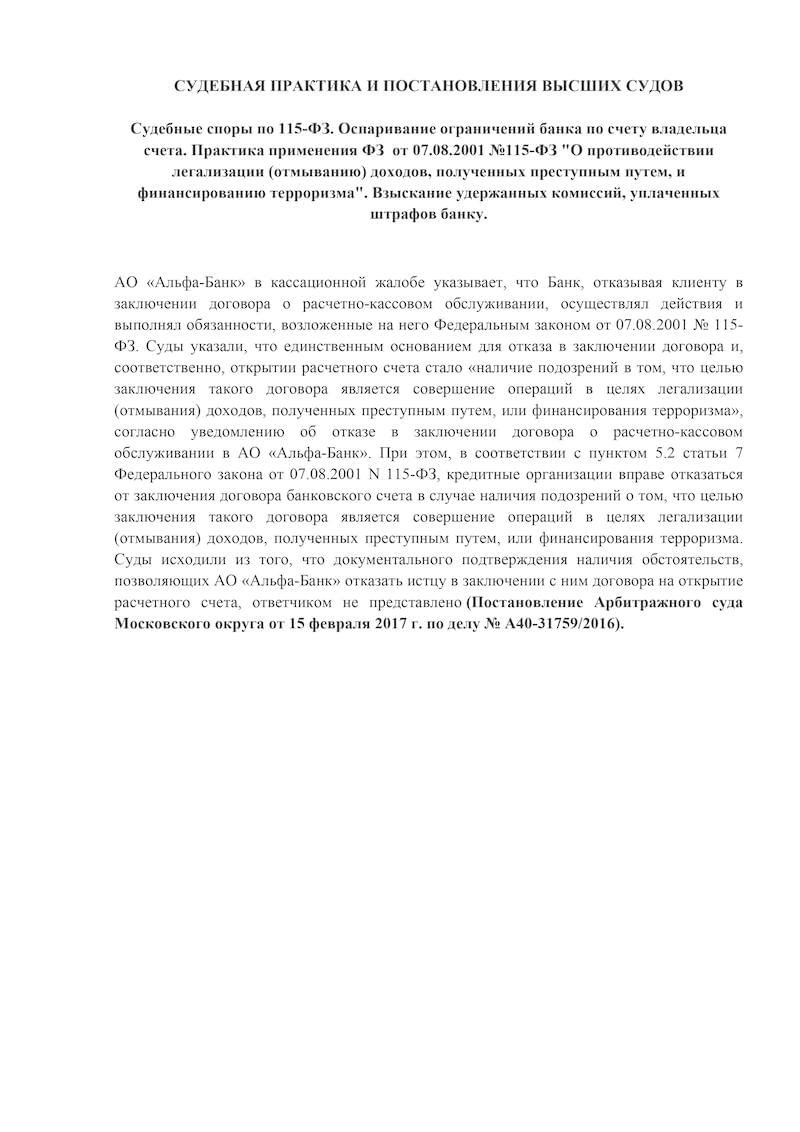 Хотя существует положительная судебная практика по делам об оспаривании удержания комиссии, для ускорения процесса, специалисты ФЮС не стали спешить обращаться в Арбитражный суд. Первоначально, были направлены обращения, жалобы и требования в надзорные органы с описанием и аргументацией незаконности «Бандитских» действий банка. После подтверждения нашей правовой позиции со стороны надзорных органов, в том числе ЦБ РФ, юристы направили в банк Зенит Претензию о возврате незаконно отнятых средств клиента с приложениями ответов от надзорных органов.